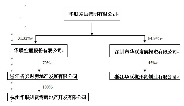 2、华联发展集团有限公司(以下简称“华联集团”)为本公司控股股东,持有本公司31.32%股权,本公司持有浙江省兴财房地产发展有限公司(以下简称“兴财房地产公司”)70%股权,华联进贤湾公司为兴财房地产公司持股100%的全资子公司;另外,华联集团持有深圳市华联发展投资有限公司(以下简称“华联投资公司”)94.94%股权,华联投资公司持有华联杭州湾公司45%股权。因此,本次交易构成关联交易。