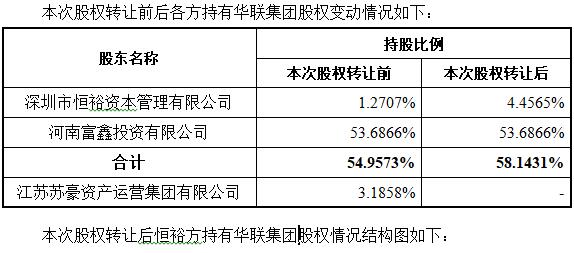 3.恒裕方收购华侨城集团持有的华联集团股权完成后,合计将持有华联集团70.2273%股权。恒裕方将成为华联集团实际控制人,并间接成为华联控股的实际控制人。