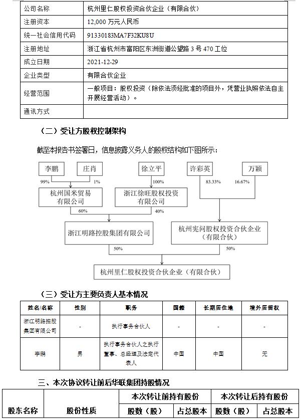 2022年1月5日,华联控股股份有限公司(以下简称“本公司”、“华联控股”或“上市公司”)分别收到华联发展集团有限公司(以下简称“华联集团”)《关于转让所持华联控股部分股份暨持股比例低于30%的函》和杭州里仁股权投资合伙企业(有限合伙)(以下简称“杭州里仁”或“受让方”)《关于受让华联控股股份有限公司部分股份的函》,根据上述函告显示:华联集团将其所持有的华联控股部分股份转让给杭州里仁,有关情况如下: